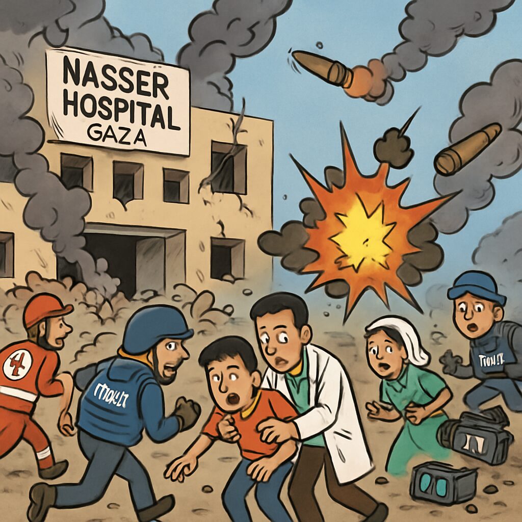 The attack killed five journalists: Hussam Al-Masri (Reuters), Mariam Abu Dagga and Moath Abu Taha (freelancers working with AP and Reuters), Ahmed Abu Aziz (Middle East Eye), and Mohammad Salama (Al Jazeera). The Hamas-run health ministry reported additional deaths among rescue workers and patients. Nasser Hospital is the only functioning hospital in southern Gaza, and the strike has exacerbated the already dire healthcare crisis, with staff describing unbearable pressure.
