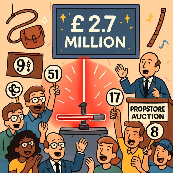 A lightsaber used by Darth Vader in the original Star Wars films has been sold for £2.7 million at an auction in Los Angeles, setting a new record for the highest-priced Star Wars memorabilia. The auction, organized by Propstore, a UK-based auction house, took place on September 4, 2025, and featured over 400 items on its first day, with the lightsaber being the highlight. The specific lightsaber prop was utilized in key scenes from “The Empire Strikes Back” and “Return of the Jedi,” and is renowned as one of the most iconic items in cinema history. It was extensively used during filming at Elstree Studios in Hertfordshire, UK, and its authenticity and historical significance drove the high bid. Other notable sales included a Harry Potter Platform 9 3/4 sign, which sold for £102,573, far exceeding its estimated range of £14,925 to £29,850. The whip and holster set used by Harrison Ford in “Indiana Jones and the Last Crusade” fetched £360,000, and a neuralyzer from “Men in Black” went for £233,900. Additionally, the Ressikan flute from “Star Trek: The Next Generation” sold for £299,400, and Longclaw, the sword from “Game of Thrones,” for £70,170. Brandon Alinger, Chief Operating Officer of Propstore, described the sale as a landmark moment not just for the company but for the entire world of film collecting. He emphasized that the lightsaber symbolizes the enduring cultural power of Star Wars and the passion of fans who view these artifacts as touchstones of modern mythology. The first day of the auction generated total sales of £10,618,530, including buyer’s premiums, showcasing the lucrative market for authentic film props. The event was conducted live, allowing global participation, which contributed to the competitive bidding and high prices. The auction continues on Friday and Saturday with an additional 600 items listed for sale, indicating robust and sustained interest in cinematic memorabilia. This ongoing activity suggests that the market remains strong, with potential for more record-breaking sales. This record-setting sale highlights the significant value that collectors place on pieces of film history, driven by nostalgia and a desire to own a part of beloved franchises. It may set a precedent for future auctions, influencing how such items are valued and preserved for cultural heritage.