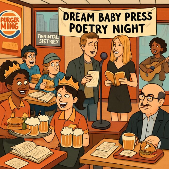 The evening kicked off with Dream Baby Press founder Matt Starr, who read poems from his book “Mouthful” that explored sexually charged themes like fraternal power-tool play and A-list incest, setting a provocative and engaging tone for the audience. Starr’s performance highlighted the press’s commitment to pushing boundaries, as attendees enjoyed burgers and beer in the casual setting of the fast-food chain, which added an ironic contrast to the sophisticated content.