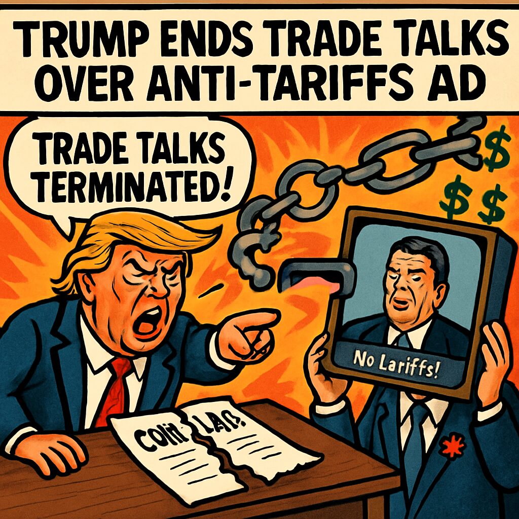 U.S. President Donald Trump has abruptly terminated all trade negotiations with Canada, citing an anti-tariff advertisement by the Ontario government that he labeled as fraudulent. The ad features the voice of former President Ronald Reagan criticizing tariffs, sparking controversy and leading to the collapse of ongoing talks.