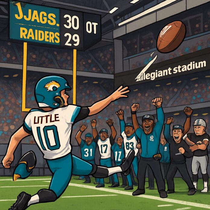 Jacksonville Jaguars kicker Cam Little made NFL history by drilling a record-breaking 68-yard field goal, which sparked his team to a dramatic 30-29 overtime victory over the Las Vegas Raiders on Sunday. The kick, which came as time expired in the first half, set a new benchmark for the longest field goal in league history.
