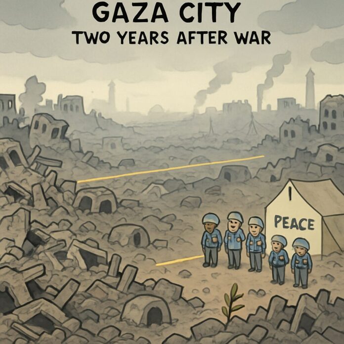 From an embankment overlooking Gaza City, the view is one of complete destruction, with familiar landmarks erased and replaced by a monochrome expanse of rubble stretching from Beit Hanoun to Gaza City. This area, once densely populated, is now unrecognizable, with only distant building shapes hinting at its former identity. The devastation is so extensive that it is difficult to orient oneself or identify the neighborhoods that housed tens of thousands of people before the conflict.