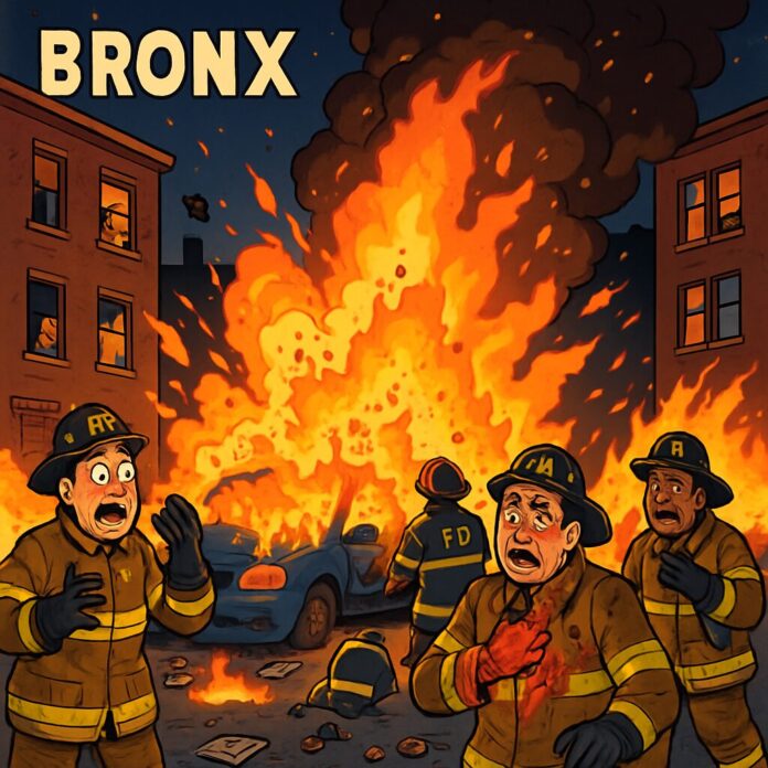 A massive vehicle explosion in the Bronx injured seven firefighters on Wednesday evening, sending a huge fireball into the night sky after a trash fire spread to parked cars.
