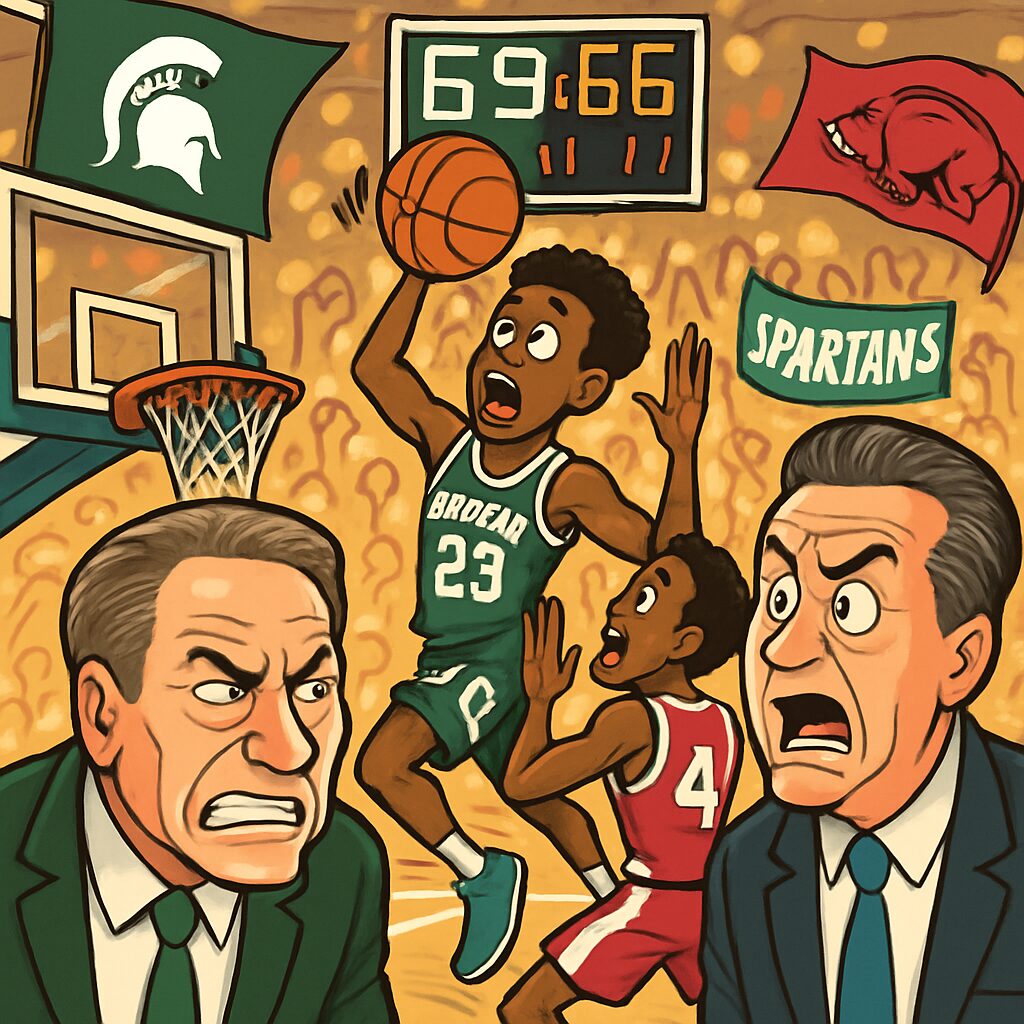 In a battle of legendary coaches, No. 22 Michigan State narrowly defeated No. 14 Arkansas 69-66 on Saturday night, with Tom Izzo’s Spartans overcoming John Calipari’s Razorbacks in a game that showcased freshman talent and intense competition.