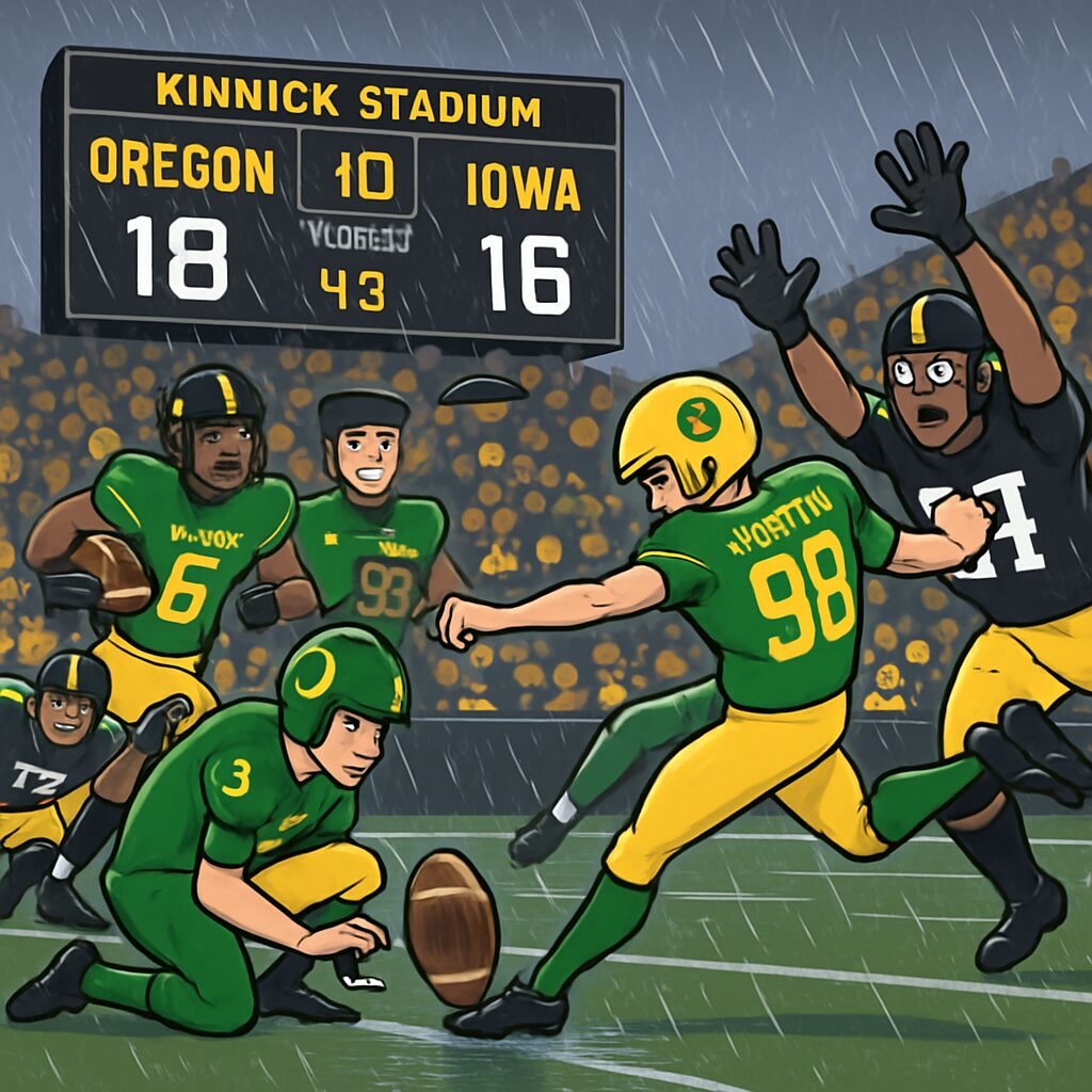 Atticus Sappington kicked a 39-yard field goal with three seconds remaining to lift No. 6 Oregon to an 18-16 victory over No. 20 Iowa, narrowly avoiding an upset in a defensive battle played in rainy conditions at Kinnick Stadium. The win keeps Oregon’s College Football Playoff aspirations alive while dealing a blow to Iowa’s postseason hopes.