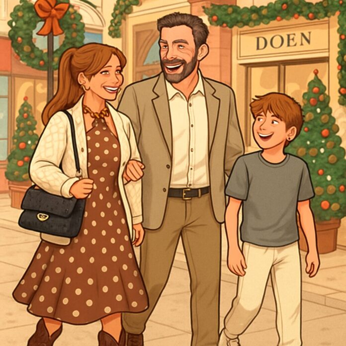 For the occasion, Lopez embraced a festive yet comfortable look, wearing a brown-and-white polka dot halter dress under a cream cable-knit sweater, paired with cowboy boots and a Chanel bag. Affleck coordinated in earth tones, opting for a cream linen button-down shirt and matching blazer with khaki pants and brown boots. Samuel kept it casual in a gray T-shirt, cream sweatpants, and white sneakers, blending seamlessly with the adults’ subdued palette.