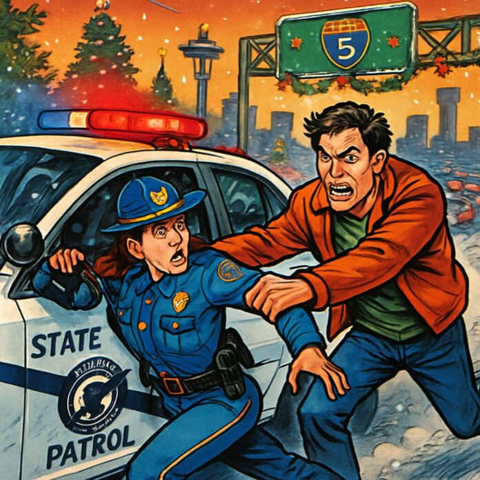 On December 25, 2025, a brazen carjacking incident shocked Seattle when a man assaulted a Washington State Patrol lieutenant, stole her patrol car, and led police on a pursuit that ended with his arrest. Exclusive video obtained by TMZ shows the suspect casually crossing Interstate 5 before approaching the stopped patrol vehicle, yanking the female officer from the driver’s seat, shoving her to the pavement, and speeding away in the marked car.
