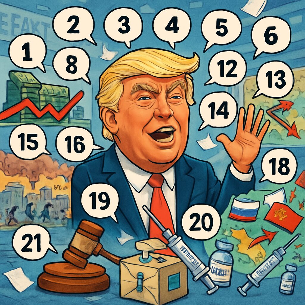 On health care and legislation, Trump spread dangerous vaccine misinformation, claiming babies receive ’80-plus vaccines at once,’ which is factually incorrect, and made false statements about various policies to support his agendas. These lies not only mislead the public but also pose risks to public health and democratic processes.