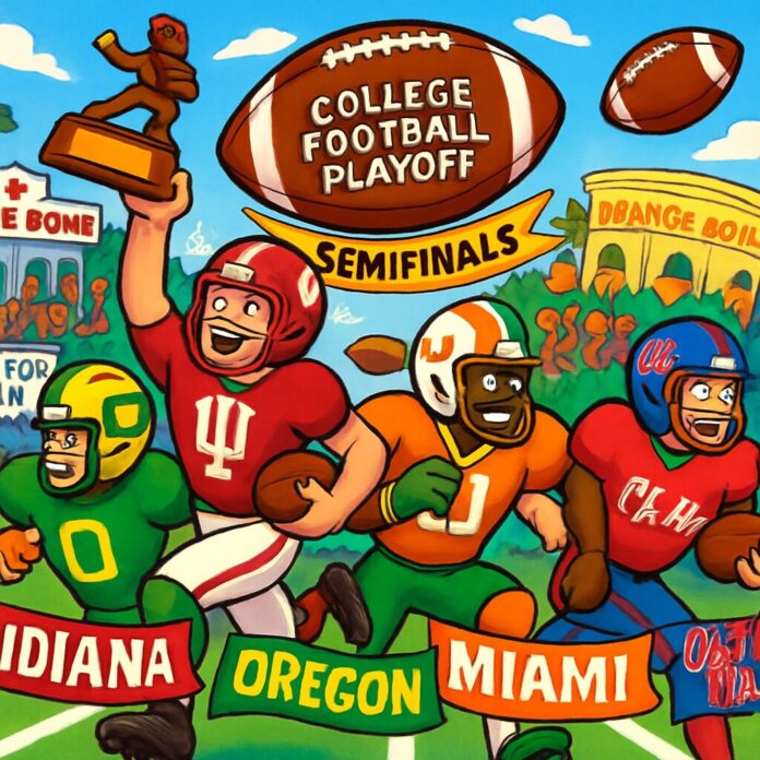 The semifinals are scheduled for January 8-9, 2026, with Miami vs. Ole Miss in the Fiesta Bowl at State Farm Stadium in Glendale, Arizona, and Indiana vs. Oregon in the Peach Bowl at Mercedes-Benz Stadium in Atlanta. The winners will advance to the national championship game on January 19 at Hard Rock Stadium in Miami Gardens, Florida.