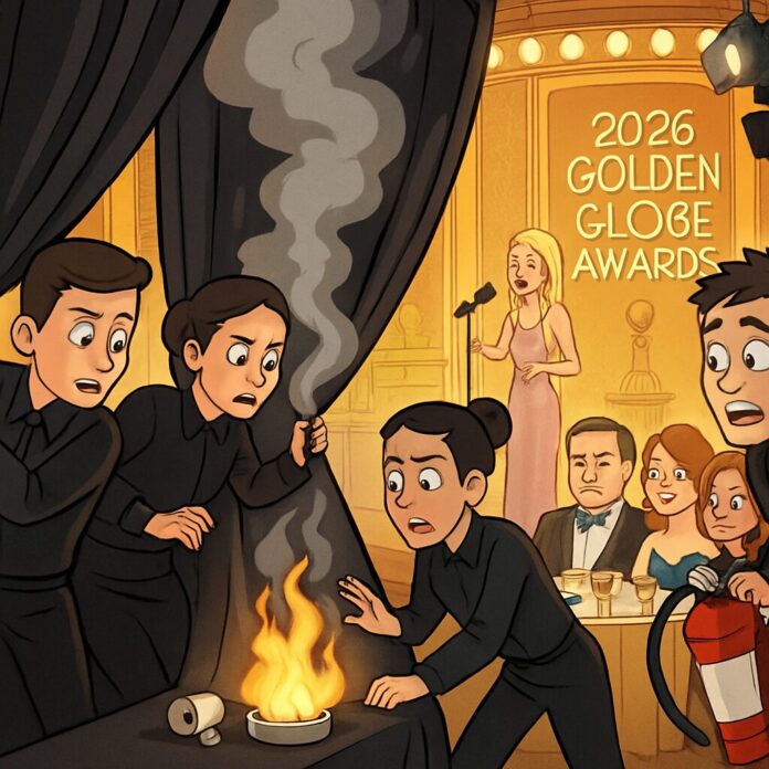 During the 2026 Golden Globes ceremony, a small fire ignited backstage in the press room, prompting a frantic response from staff who quickly extinguished the flames, allowing the awards show to continue seamlessly.