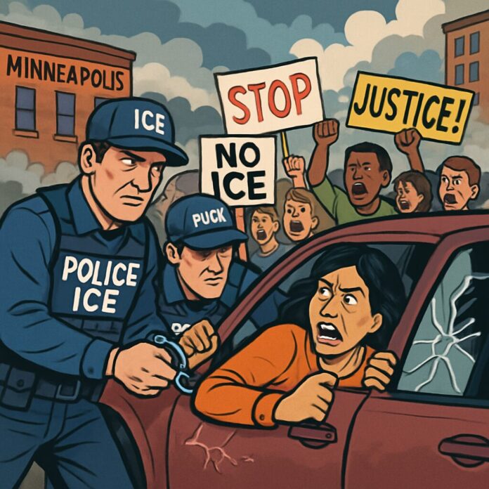 U.S. Immigration and Customs Enforcement (ICE) agents in Minneapolis forcibly removed a woman from her vehicle during ongoing immigration enforcement operations, an incident captured on video and occurring amid heightened tensions following a fatal shooting by an ICE agent last week. The event has sparked further protests and legal action by state authorities against the federal government, highlighting the deepening conflict over immigration policy in the region.