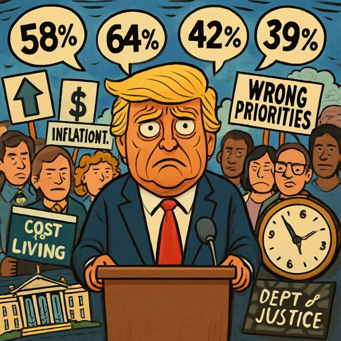 Economic dissatisfaction is compounded by broader disapproval. Approximately 47% of Americans disapprove of Trump’s foreign policy efforts, 42% question his handling of law and order, and 41% criticize his approach to issues like free speech and Department of Justice management. These figures suggest a comprehensive rejection of his administrative priorities across multiple domains.