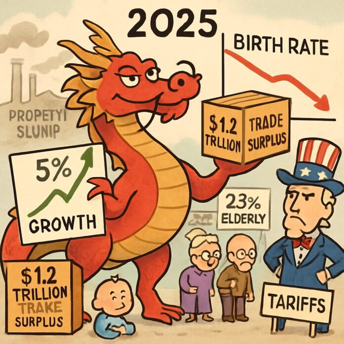 China has announced that its economy grew by 5% in 2025, meeting the government’s target, while simultaneously reporting a record low birth rate that underscores deepening demographic challenges, all amid persistent trade tensions with the United States.