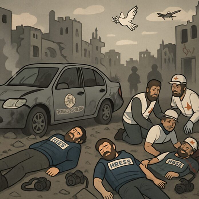 An Israeli military strike in central Gaza on Wednesday killed three Palestinian journalists who were documenting displacement camps, according to first responders, marking a grim escalation in the ongoing conflict. The incident occurred in the al-Zahra area, where a car belonging to the Egyptian Relief Committee was hit, with Gaza’s Hamas-run Civil Defence agency identifying the victims as Mohammed Salah Qashta, Anas Ghneim, and Abdul Raouf Shaat.