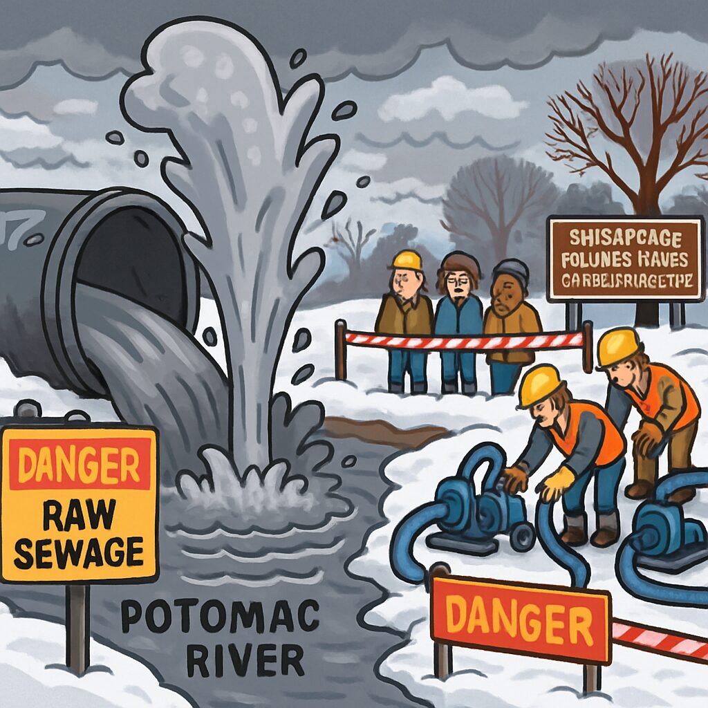 The rupture occurred in Montgomery County, Maryland, along Clara Barton Parkway near the Chesapeake and Ohio Canal National Historic Park. A 72-inch diameter pipe, part of the Potomac Interceptor system installed in the 1960s, collapsed, shooting sewage out of the ground and into the river. DC Water, the utility responsible, discovered the overflow on January 19 and has been providing daily updates since.