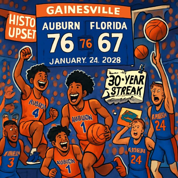Auburn University’s men’s basketball team achieved a landmark victory by upsetting the 16th-ranked Florida Gators 76-67 on Saturday, January 24, 2026, in Gainesville, Florida. This win ends a 30-year drought for Auburn at Florida’s home court, dating back to 1996, and represents a significant upset over a defending national champion favored by double digits.