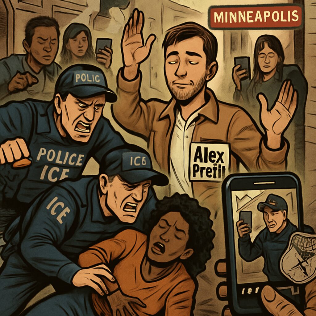 Video evidence reviewed by news outlets shows Pretti standing on the street holding his phone, apparently recording the federal officers as they conducted their enforcement activities. He can be seen directing traffic to allow cars to pass, and at one point, he steps in to assist a woman who was violently pushed to the ground by an agent.