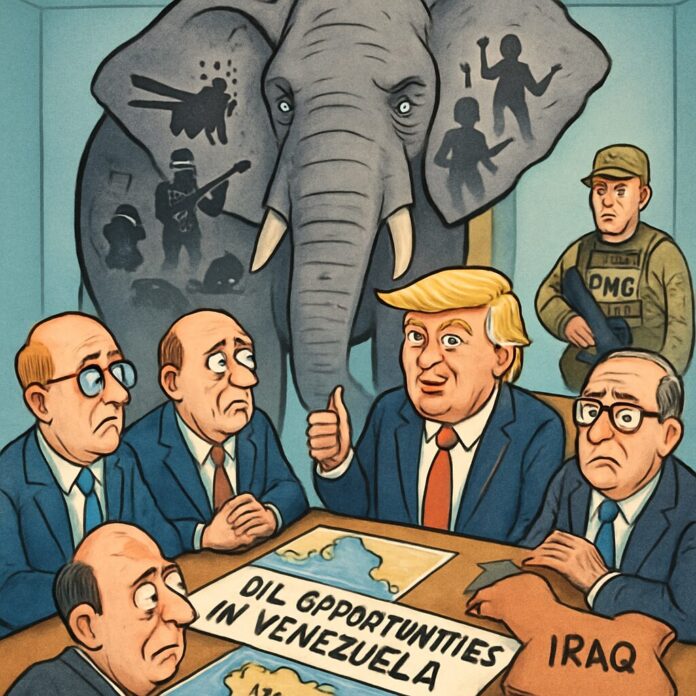 To address security concerns, the Trump administration plans to use private military contractors to protect oil assets in Venezuela, reminiscent of the extensive use of contractors during the Iraq War. However, this approach has been marred by controversies, such as civilian killings, and may not assure oil companies of stability.