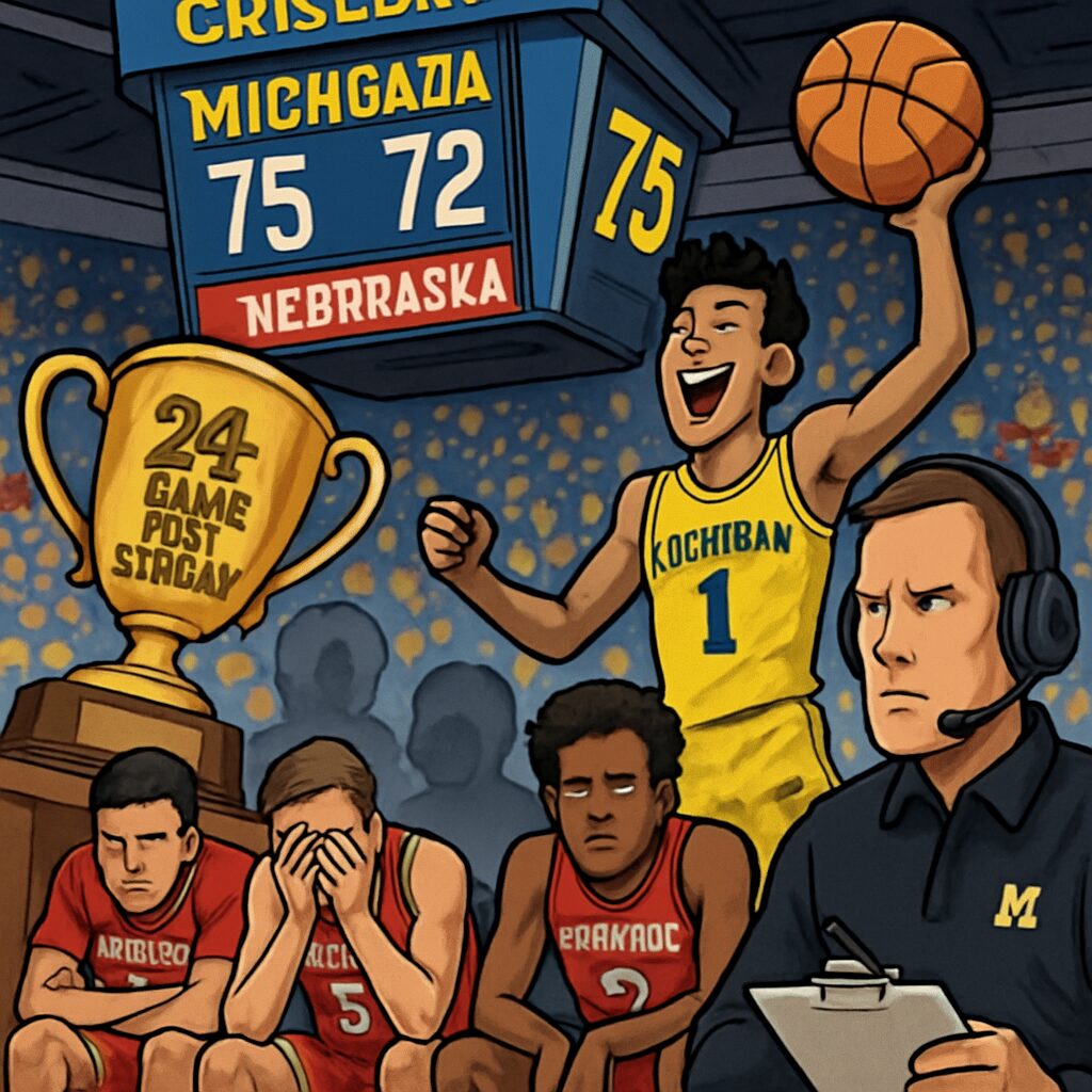Nebraska’s remarkable 24-game winning streak, the longest in major college basketball in over a decade, came to an end Tuesday night with a 75-72 loss to Michigan in Ann Arbor. The defeat marked the first loss for the No. 5 Cornhuskers this season and halted an improbable run that had captivated the sports world.