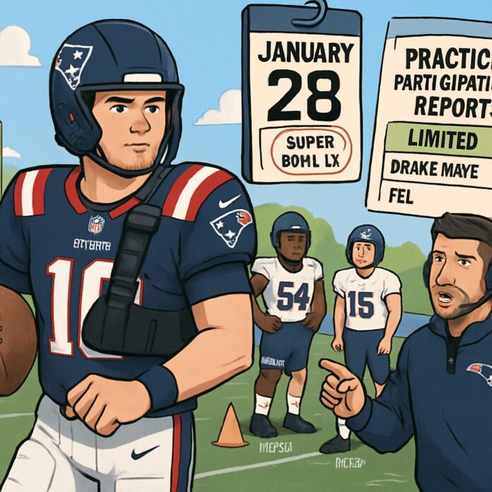 The New England Patriots have listed quarterback Drake Maye as limited on their projected injury report ahead of Super Bowl LX practices, citing a right shoulder injury that has raised concerns about his readiness for the upcoming championship game against the Seattle Seahawks.