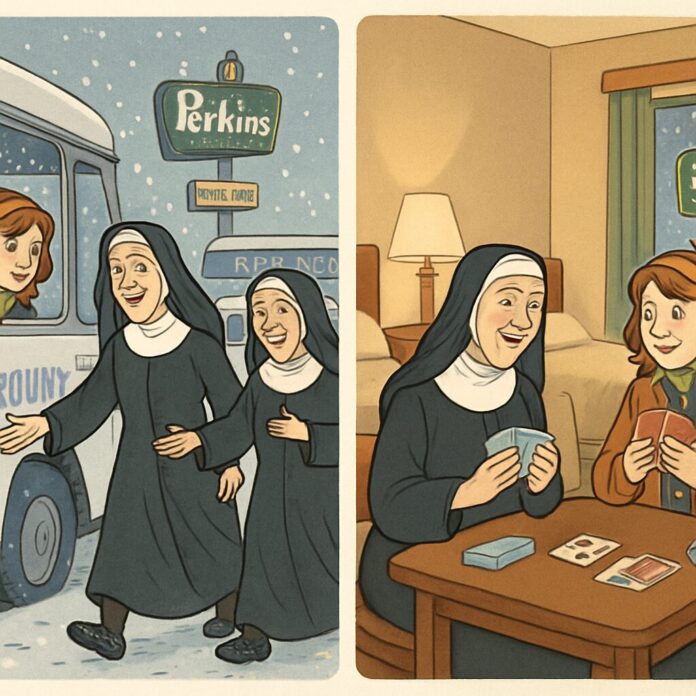 At the Perkins restaurant, the women revealed they were Sisters of Mercy, Catholic nuns teaching in Cedar Rapids, Iowa. Over burgers and fries, Diann relaxed, sharing details about her life. Concerned for her safety, the nuns invited her to share their motel room with two queen beds. Despite modern reservations, Diann felt secure and agreed, spending the evening playing canasta and bonding with her new friends.