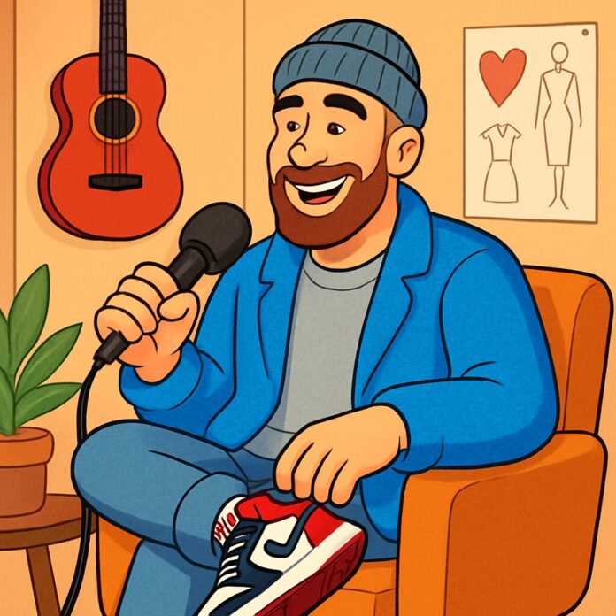 Executive summary: Travis Kelce made a subtle fashion statement by wearing a brand owned by Taylor Swift’s close friend Gigi Hadid during his first appearance on a family podcast, highlighting his connection to Swift’s celebrity circle.
