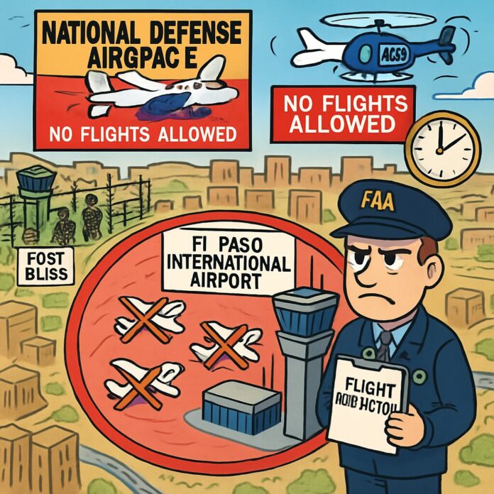 The Federal Aviation Administration has imposed a 10-day flight restriction over El Paso, Texas, and parts of southern New Mexico, citing unspecified security concerns and classifying the airspace as national defense territory, effectively grounding all commercial, cargo, and general aviation flights in the region.