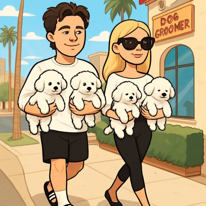 Brooklyn Beckham and Nicola Peltz were spotted in Los Angeles on February 11, 2026, twinning in matching black-and-white outfits during a leisurely stroll with their four rescue dogs. The couple, each cradling two fluffy white pups named Lamb, Label, Birdie, and Angel, made their way to a Beverly Hills dog groomer, highlighting their synchronized style and shared passion for animal welfare.